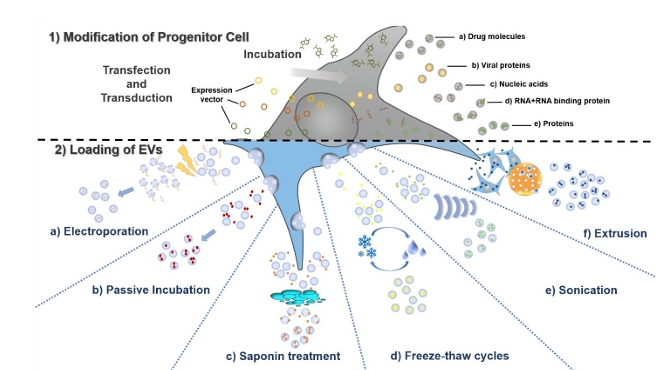 由上圖可知,內(nèi)源性裝載是在外泌體形成的生物過程中,通過直接轉(zhuǎn)染、共孵育等方法將目的藥物導(dǎo)入外泌體來源細胞,來源細胞再通過生物發(fā)生機制產(chǎn)生具有目的藥物的外泌體。目前,內(nèi)源性裝載可裝載RNA、蛋白質(zhì)、小核酸和小分子等不同類型藥物。外源性裝載是通過電穿孔或脂質(zhì)體轉(zhuǎn)染等方法將目的藥物導(dǎo)入分離后的外泌體中。目前,外源性裝載可裝載小分子化藥、蛋白質(zhì)、多肽、核酸藥物、天然產(chǎn)物等。