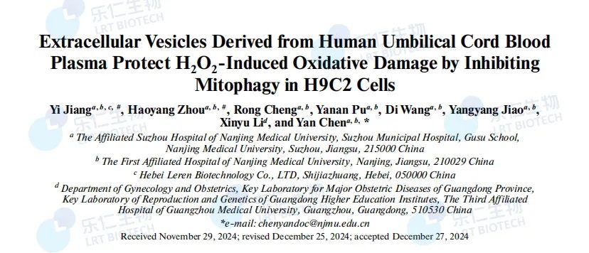 樂(lè)仁生物蔣毅博士發(fā)表SCI文章:闡明人臍血外泌體通過(guò)抑制線粒體自噬減少心肌細(xì)胞氧化損傷機(jī)制,為臍血外泌體抗氧化提供理論依據(jù)