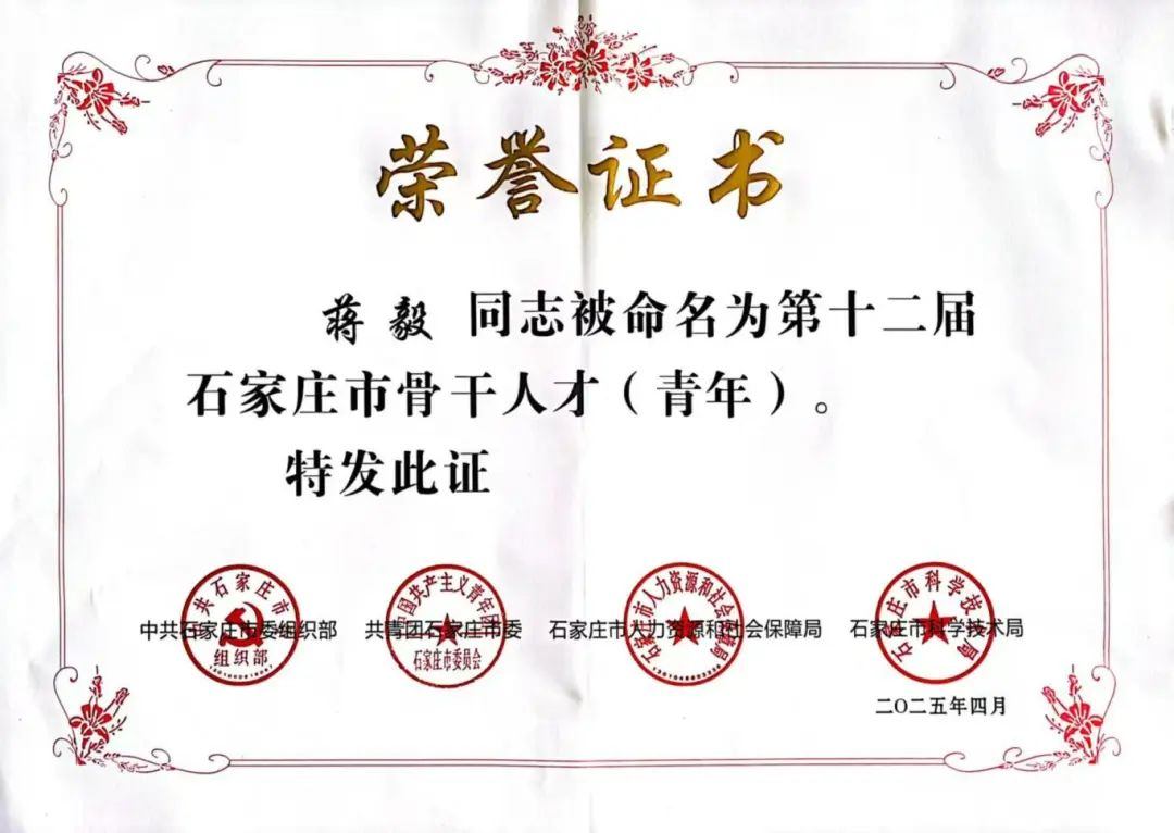 蔣毅被授予“第十二屆石家莊市骨干人才”榮譽(yù)稱號(hào)