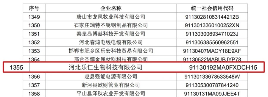 河北省科學(xué)技術(shù)廳和河北省工業(yè)和信息化廳發(fā)文公布2024年第二批納入“科技型中小企業(yè)信息庫(kù)”企業(yè)名單的公告 ,河北樂(lè)仁生物科技有限公司納入“科技型中小企業(yè)信息庫(kù)”。