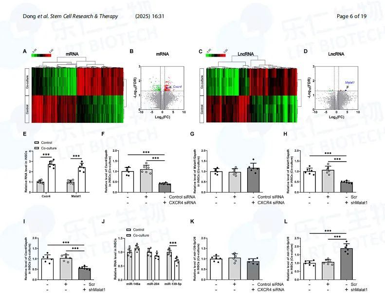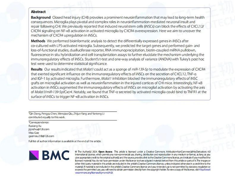 2025年2月5日,河北樂仁生物楊志軍博士與解放軍總醫(yī)院高謀博士合作,在國際權(quán)威期刊Stem Cell Research & Therapy在線發(fā)表了題為“Long non-coding RNA Malat1 modulates CXCR4 expression to regulate the interaction between in/duced neural stem cells and microglia following closed head injury” 的開拓性研究成果。