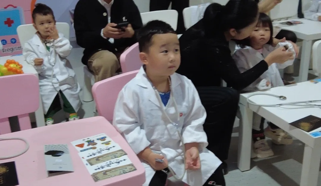 活動邀請臍寶們快樂體驗“小小醫(yī)生”職業(yè)。臍寶們身穿小小白大衣,帶著聽診器,扮演“醫(yī)生”角色,現(xiàn)場妙趣橫生,歡笑連連。