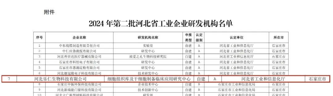 7月5日,河北省工業(yè)和信息化廳發(fā)文公布 2024 年第二批河北省工業(yè)企業(yè)研發(fā)機構(gòu)名單,河北樂仁生物科技有限公司申報的“細胞組織庫及干細胞制備臨床應(yīng)用研究中心”榜上有名。