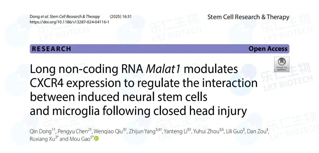 2025年2月5日,河北樂仁生物楊志軍博士與解放軍總醫(yī)院高謀博士合作,在國際權(quán)威期刊Stem Cell Research & Therapy在線發(fā)表了題為“Long non-coding RNA Malat1 modulates CXCR4 expression to regulate the interaction between in/duced neural stem cells and microglia following closed head injury” 的開拓性研究成果。